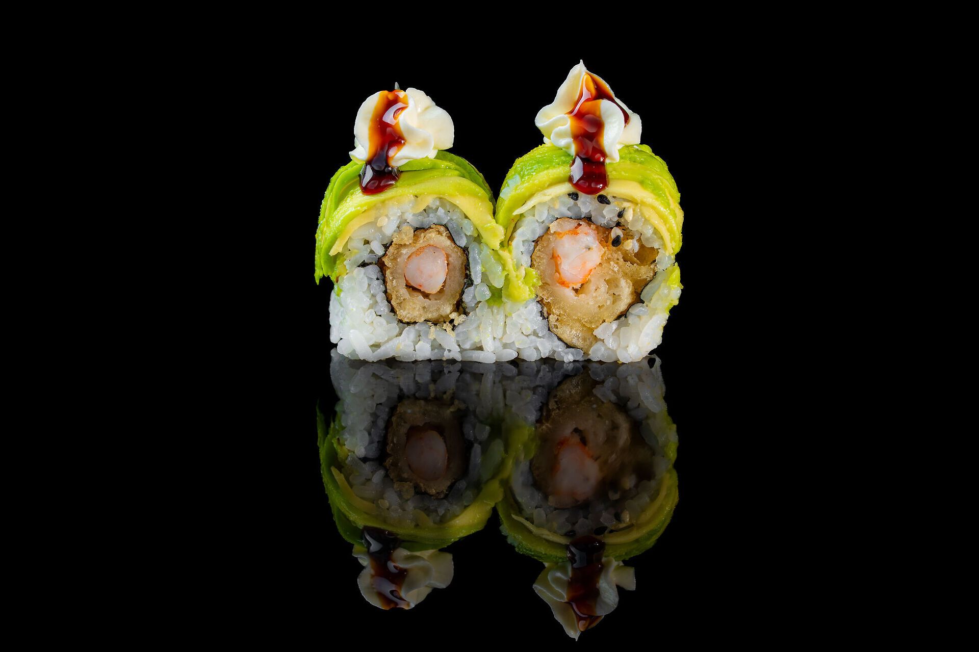 Gamberi in tempura, philadelphia, avocado, maio spicy e salsa Teriyaki