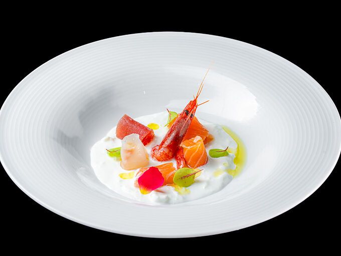 Carpaccio di pesce misto e gambero rosso su salsa bianca (panna, burrata e succo di limone)