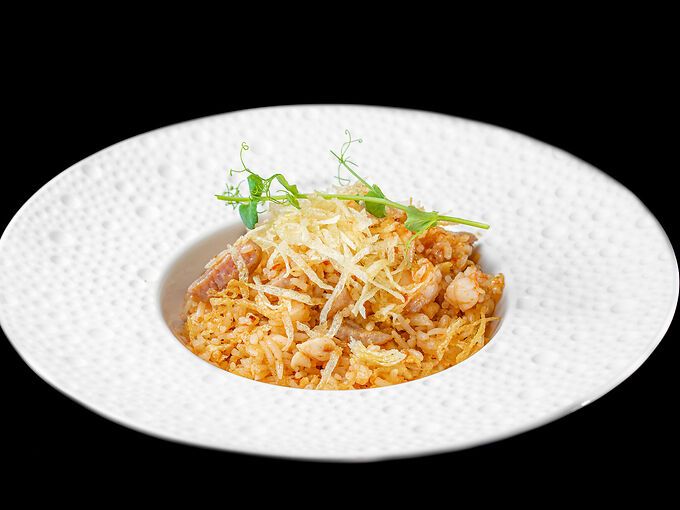 Riso saltato con gamberi, uova e verdure miste leggermente piccante