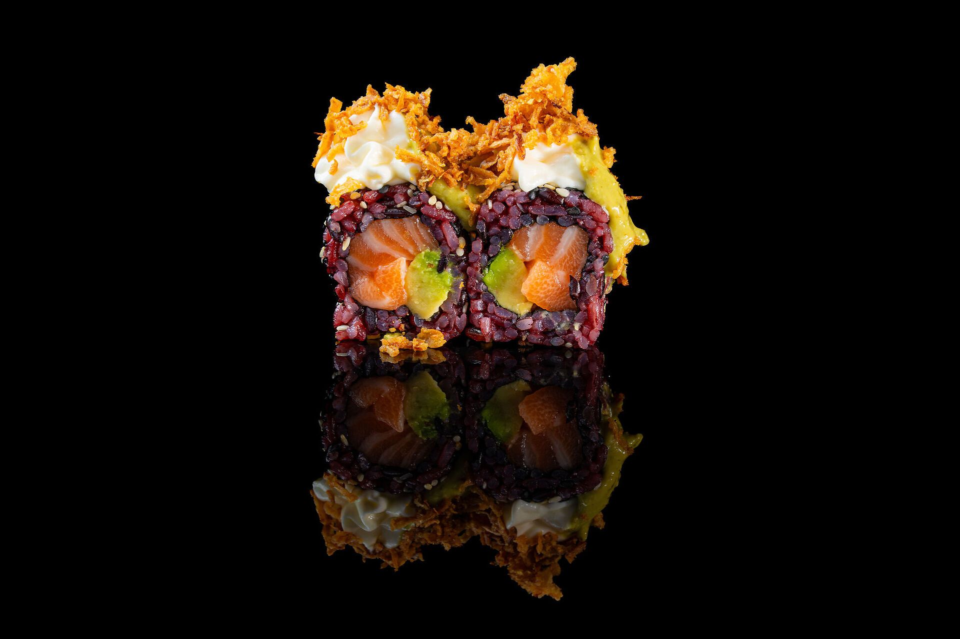 Salmone, philadelphia, avocado, salsa avocado, cipolla fritta croccante e sesamo