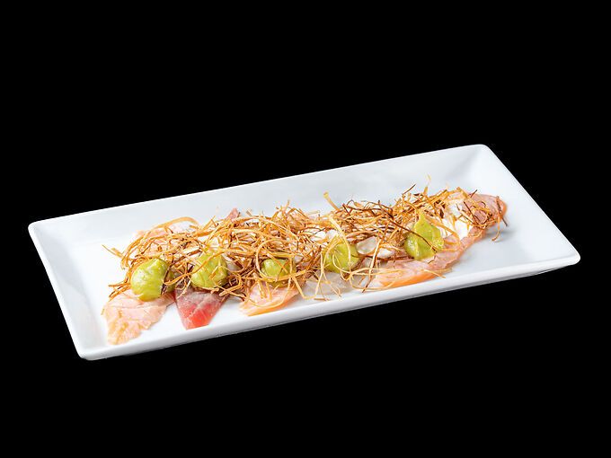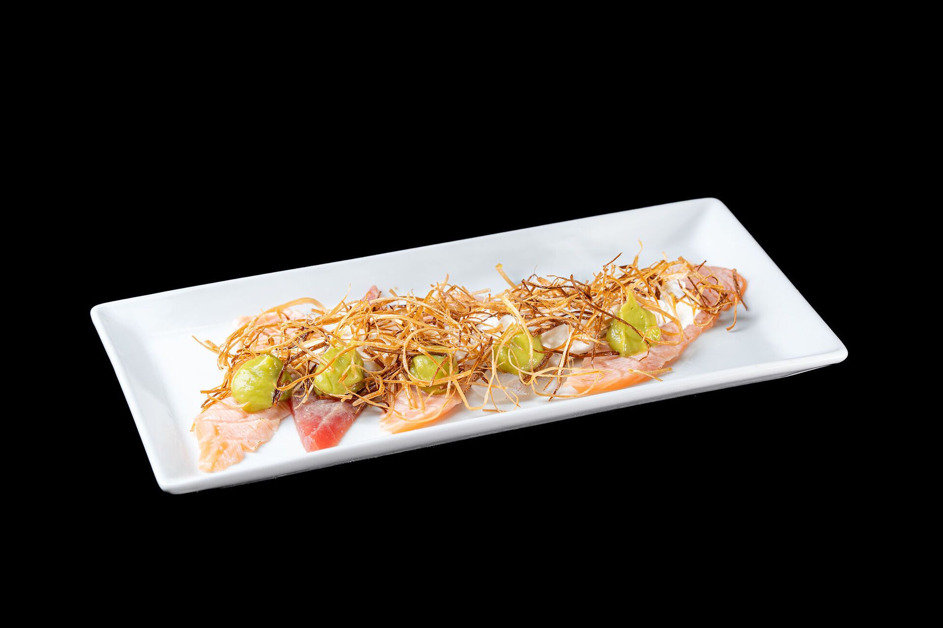 Pesce misto scottato, salsa avocado, philadelphia, porri fritti