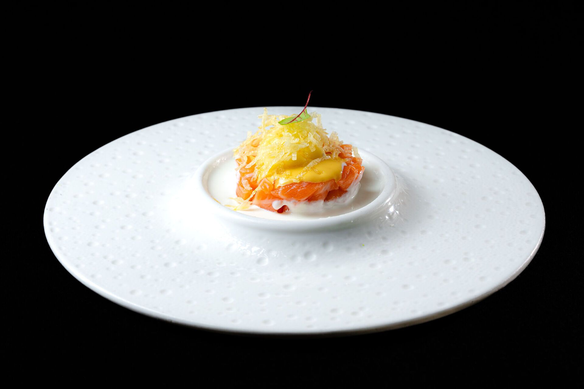 Tartare di salmone, stracciatella, mango, salsa mango e patate fritte